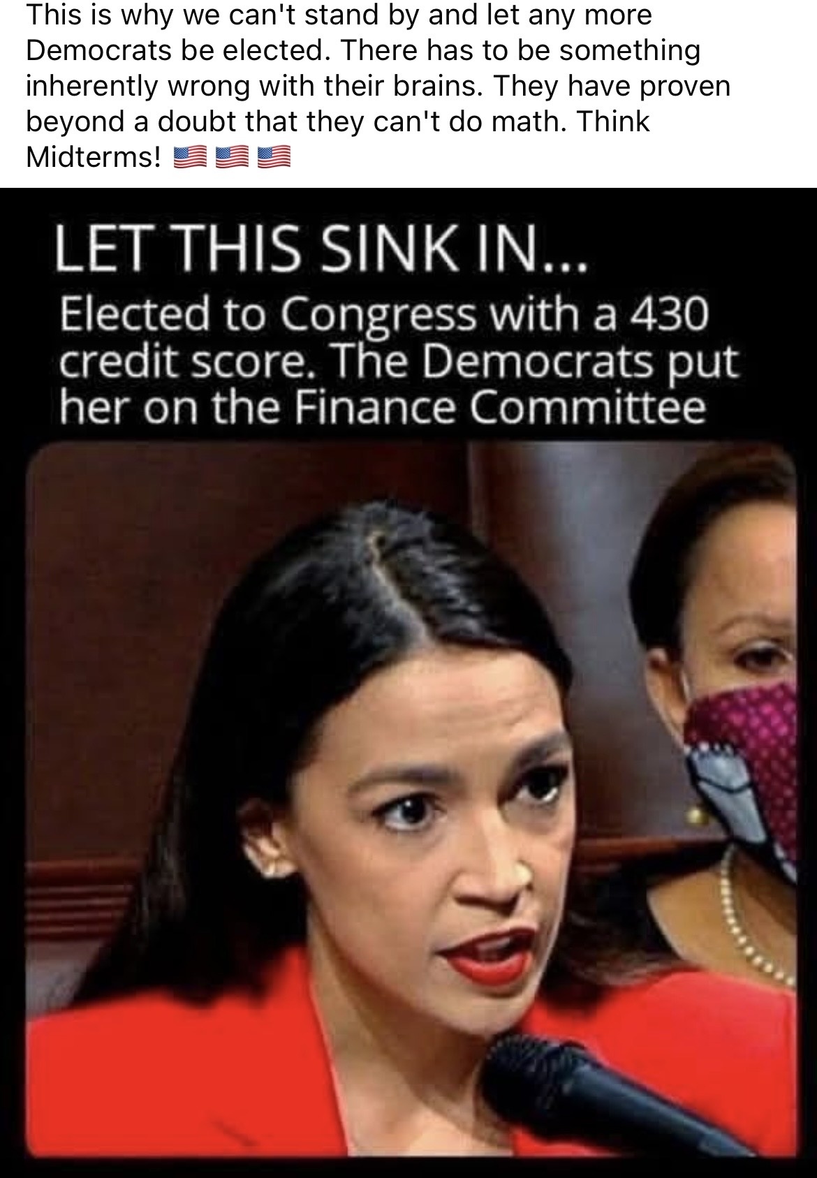 Elected to Congress with a 430 credit score. The Democrats put her on the Finance Committee