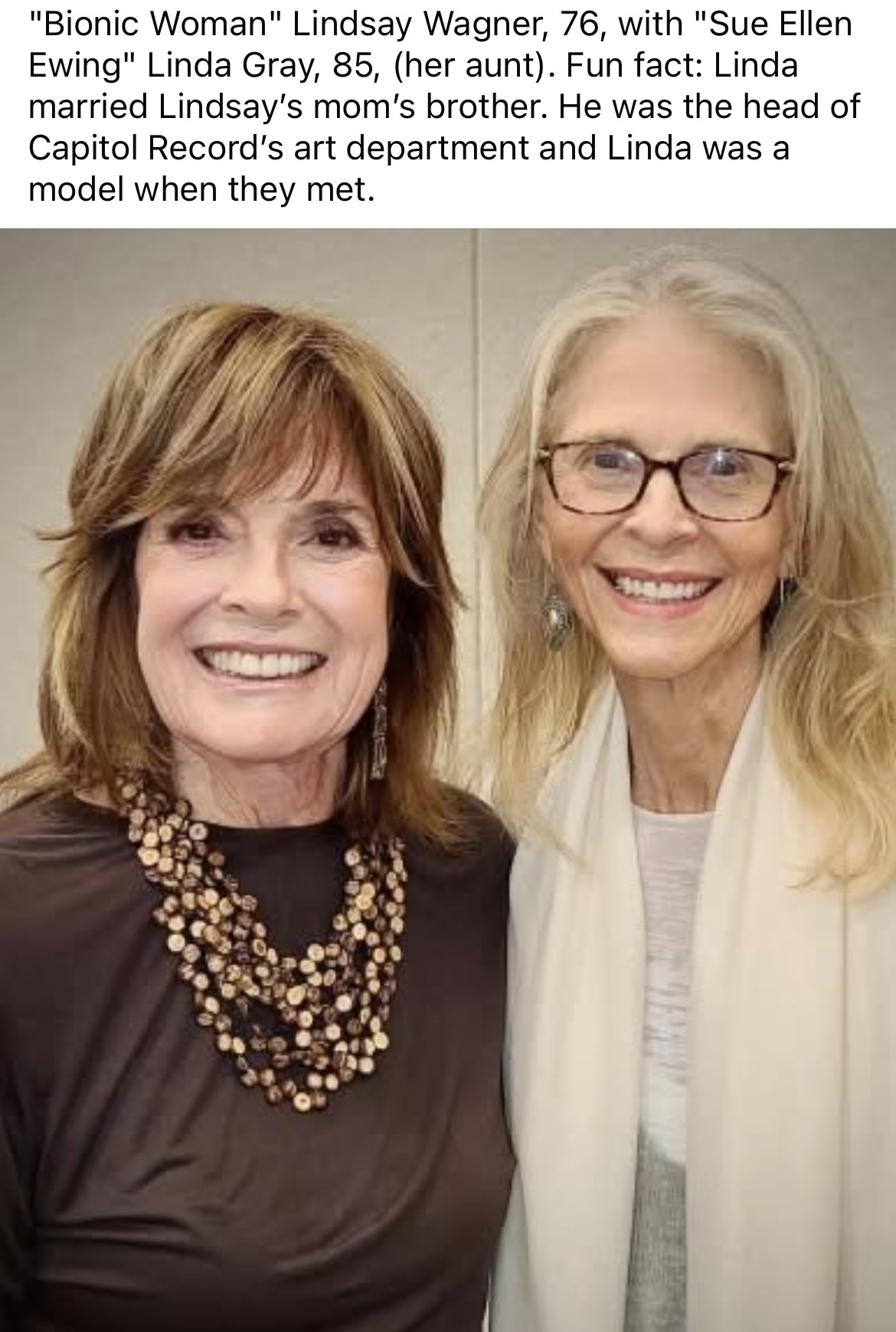 "Bionic Woman" Lindsay Wagner, 76, with "Sue Ellen Ewing" Linda Gray, 85, (her aunt). Fun fact: Linda married Lindsay's mom's brother. He was the head of Capitol Record's art department and Linda was a model when they met.