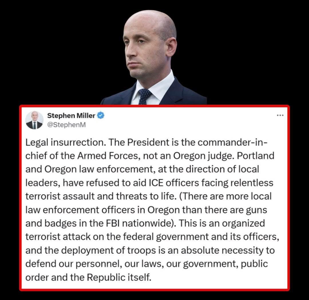 “Legal insurrection. The President is the commander-in-chief of the Armed Forces, not an Oregon judge. Portland and Oregon law enforcement, at the direction of local leaders, have refused to aid ICE officers facing relentless terrorist assault and threats to life. This is an organized terrorist attack on the federal government and its officers, and the deployment of troops is an absolute necessity to defend our personnel, our laws, our government, public order, and the Republic itself.”