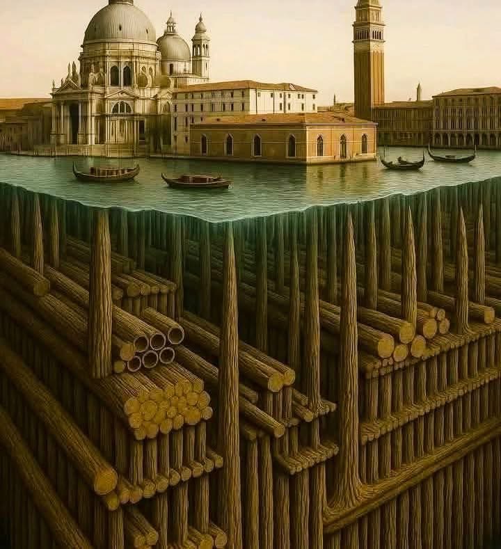 While most cities rise upon rock or concrete, Venice stands upon a submerged forest of timber.
