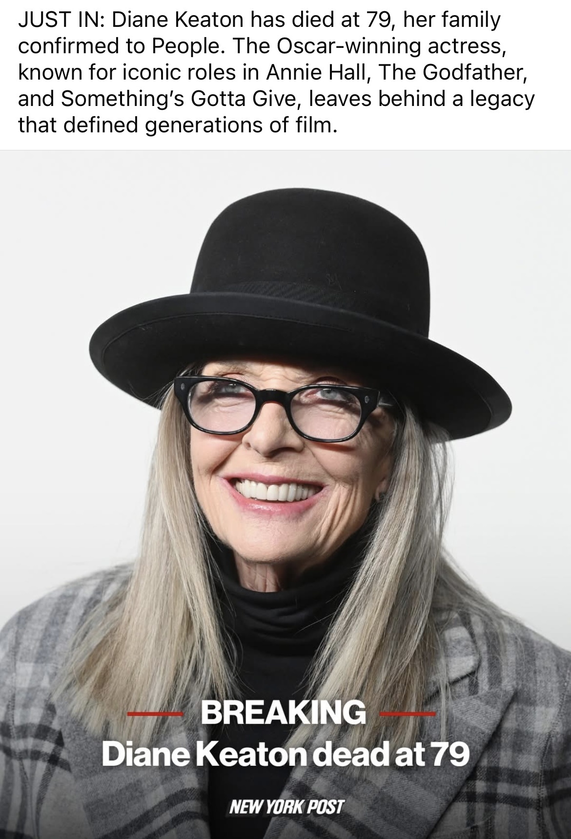 JUST IN: Diane Keaton has died at 79, her family confirmed to People. The Oscar-winning actress, known for iconic roles in Annie Hall, The Godfather, and Something's Gotta Give, leaves behind a legacy that defined generations of film.