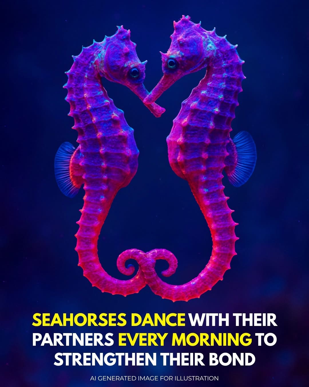 During this "morning dance," seahorses intertwine their tails, change colors, and mirror each other's movements. This ritual strengthens their monogamous bond and helps synchronize their reproductive cycles. By engaging in this daily interaction, they ensure mutual readiness for reproduction and reinforce their partnership.