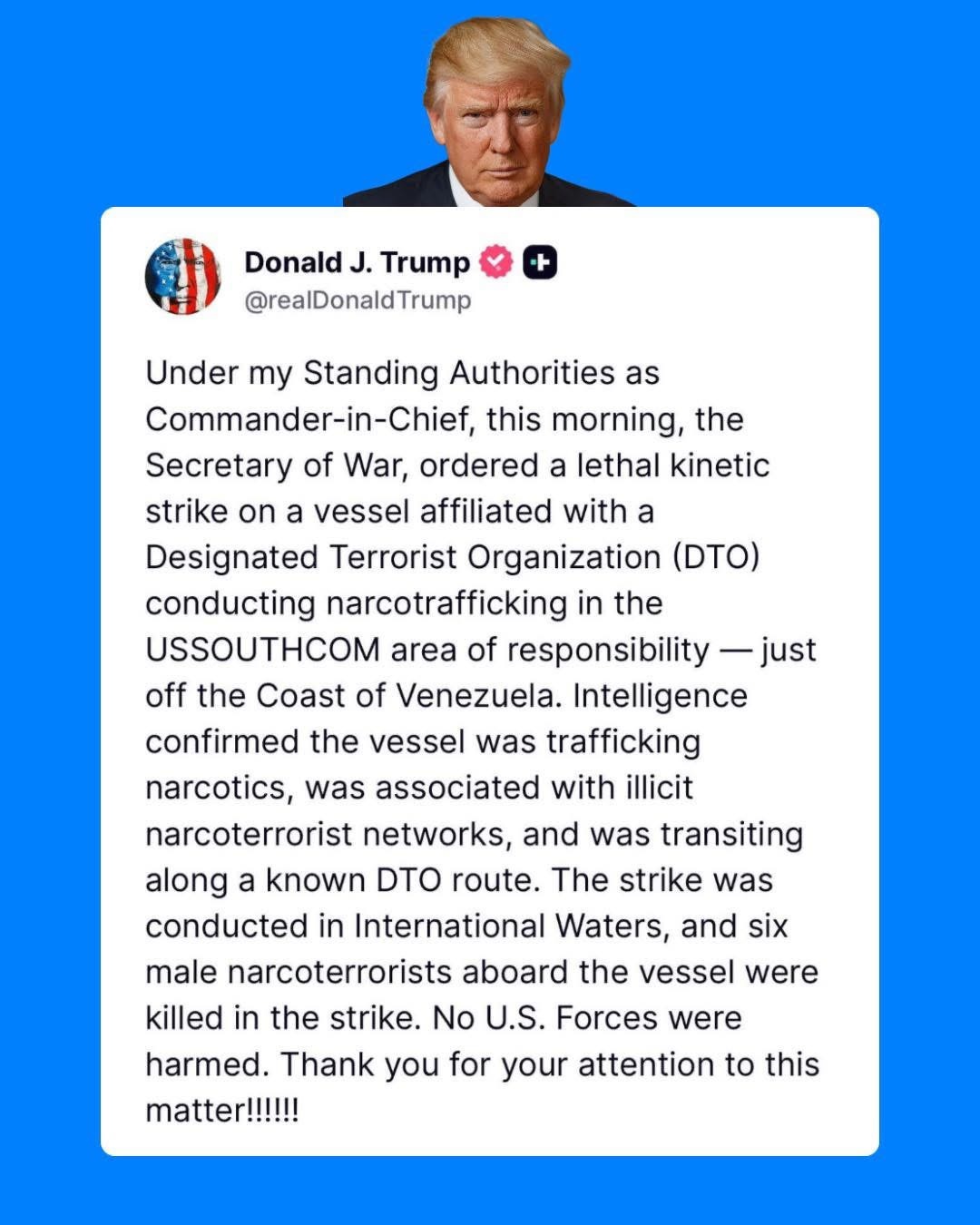 Under his Standing Authorities, Trump confirmed a lethal strike on a narco-terrorist vessel off Venezuela’s coast — 6 traffickers eliminated, no U.S. casualties.
