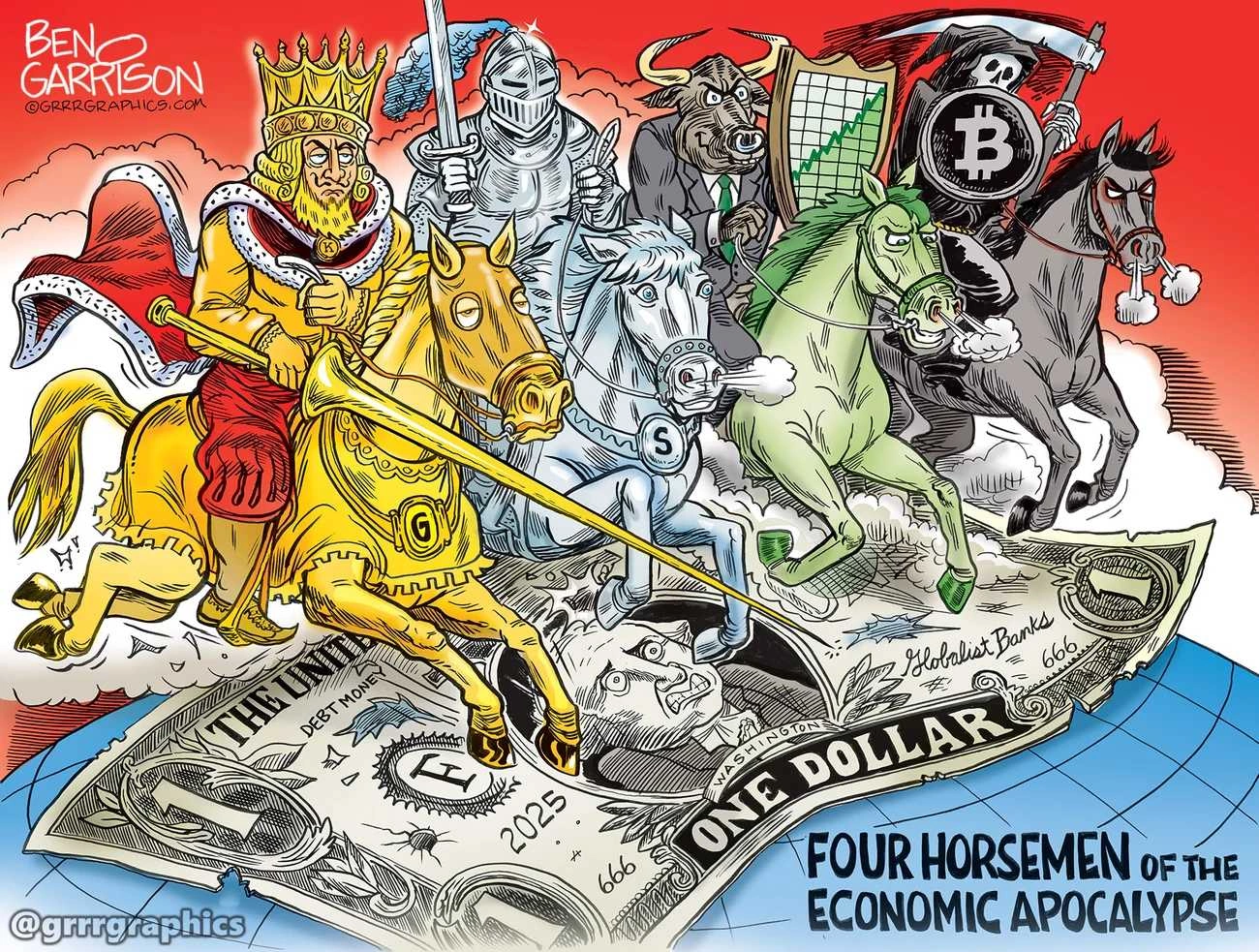 The one thing all of the horses have in common is this: They are all predicated on the dollar. People say, what’s gold, silver, a stock, or bitcoin worth today? They mean dollars—and those debt dollars are rapidly losing value. Gold, silver, stocks and Bitcoin aren’t going up—the dollar is going down and it won’t take much to prompt its collapse. It should collapse and be replaced by a currency backed by precious metals.