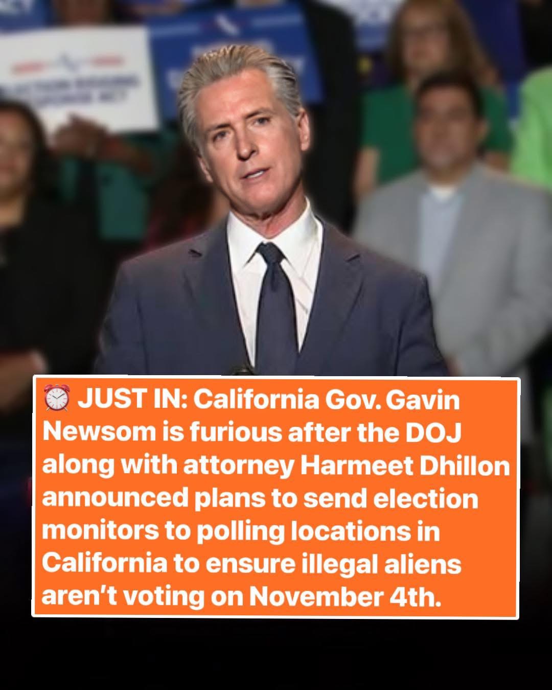 🚨 JUST IN: California Gov. Gavin Newsom is furious after the DOJ — alongside attorney Harmeet Dhillon — announced plans to send election monitors to polling sites across California to ensure illegal aliens aren’t voting on November 4th.