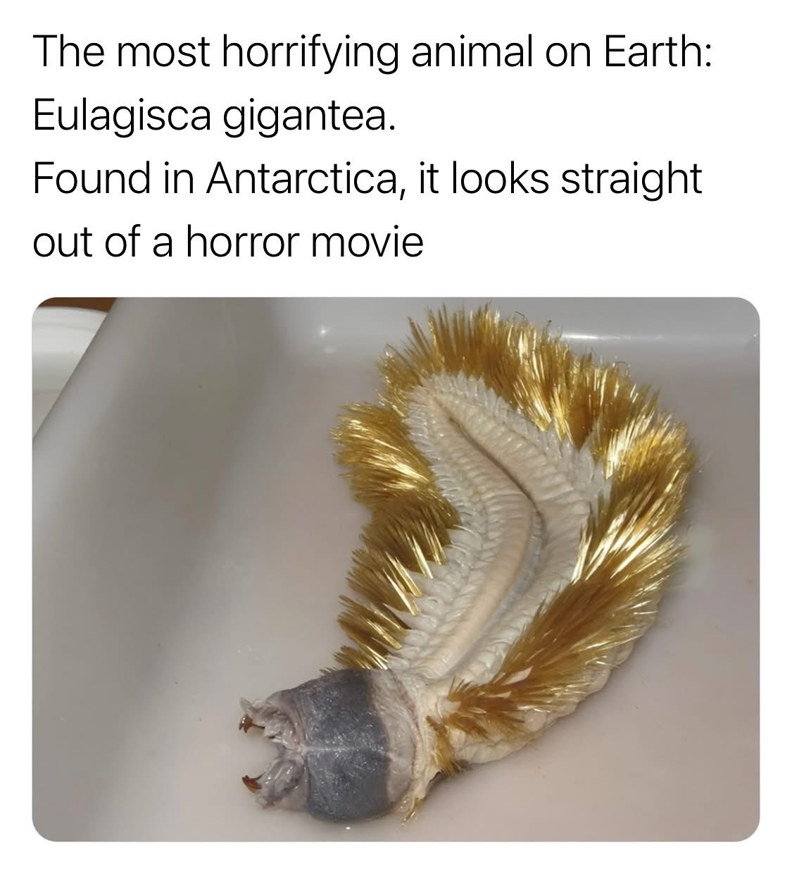Eulagisca gigantea is a deep-sea polychaete worm found in the icy waters around Antarctica. It’s part of a group known as scale worms, named for the iridescent, overlapping plates that cover their bodies. What makes this creature so unsettling is its appearance—a segmented body up to 20 centimeters long, a wide mouth filled with sharp, fang-like jaws, and a head that can suddenly extend outward to grab prey.