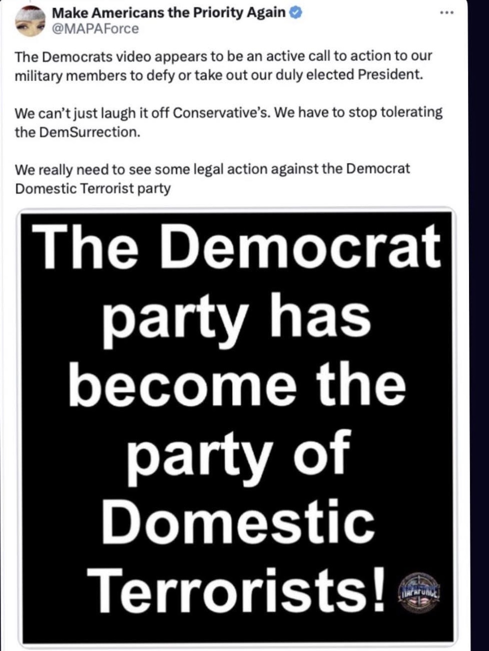 From President Trump- The Democrats video appears to be an active call to action to our military members to defy or take out our duly elected President.