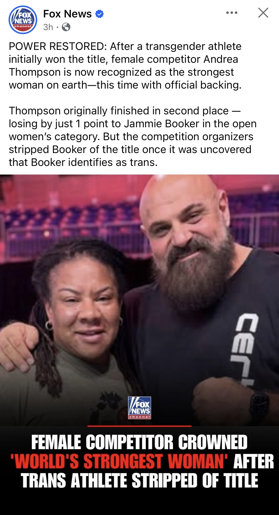 Thompson originally finished in second place — losing by just 1 point to Jammie Booker in the open women’s category. But the competition organizers stripped Booker of the title once it was uncovered that Booker identifies as trans.