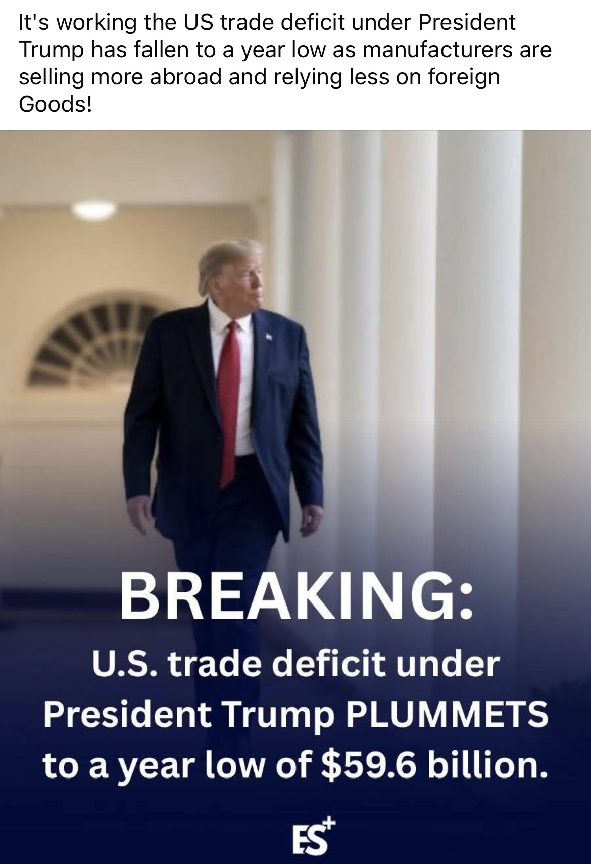 It's working the US trade deficit under President Trump has fallen to a year low as manufacturers are selling more abroad and relying less on foreign Goods!