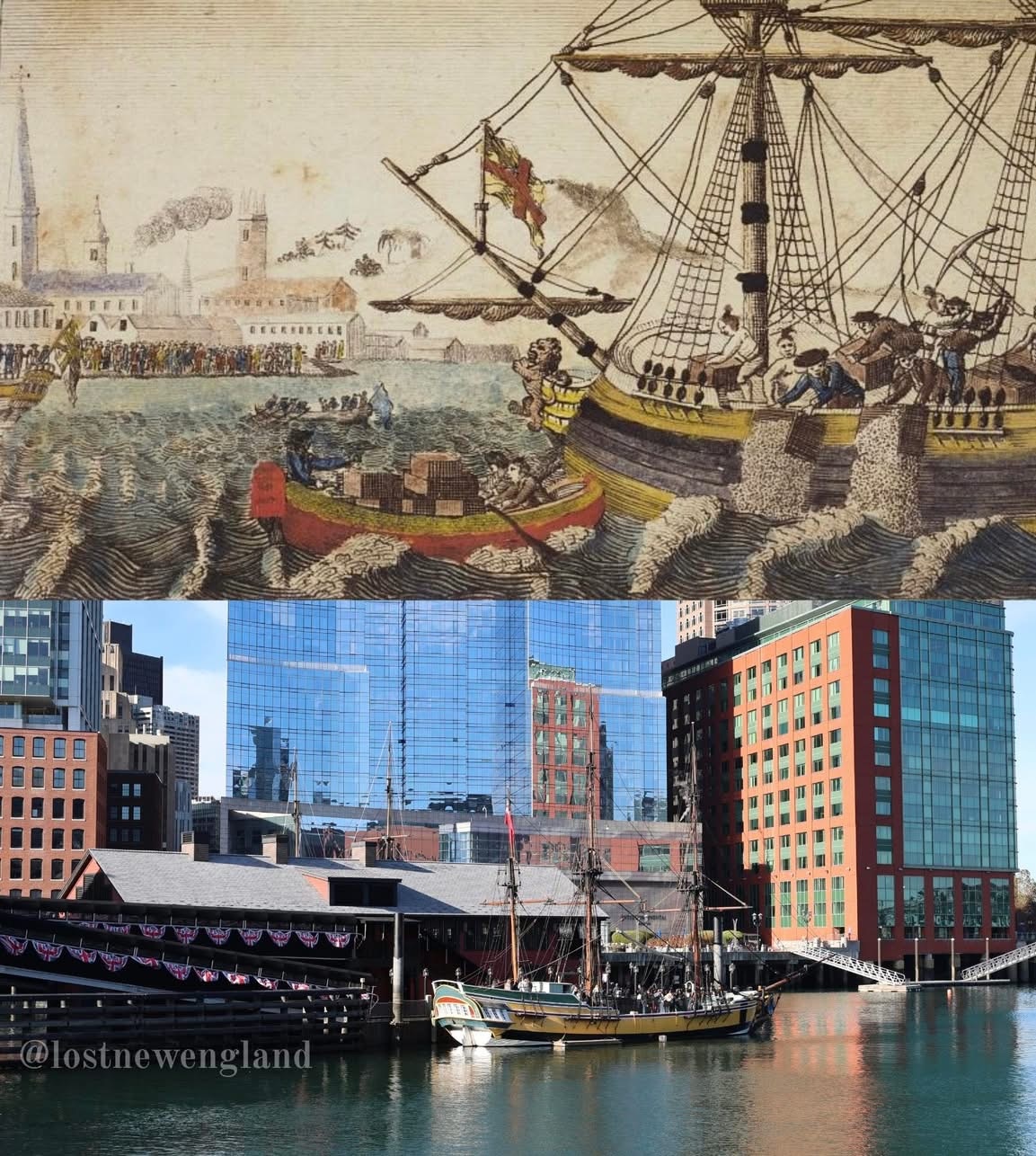 Today is the 252nd anniversary of the Boston Tea Party, which occurred near this location in Boston on December 16, 1773. The top image is a 1789 illustration of the tea party, and the bottom photo shows the scene in 2025.