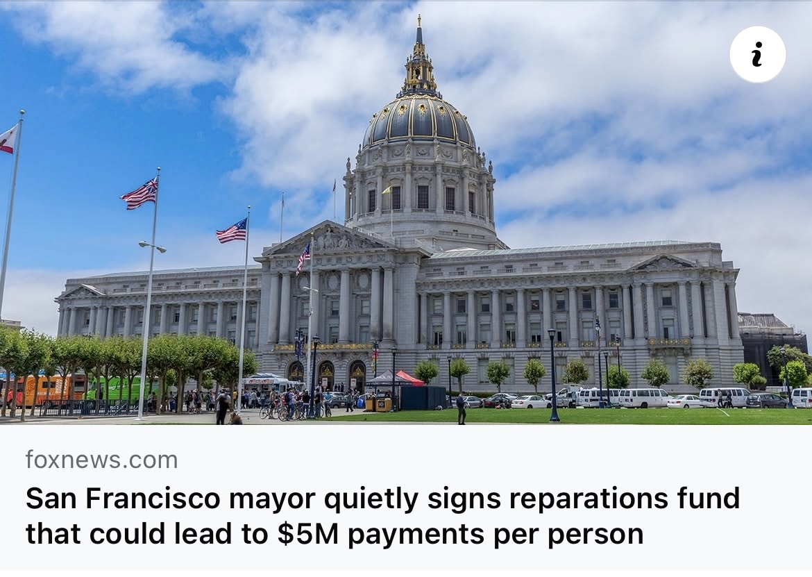 👎🏻The mayor of San Francisco signed an ordinance that creates a "Reparations Fund" that could one day grant each of the city's eligible Black residents up to $5 million in reparations for alleged historic discrimination and displacement.