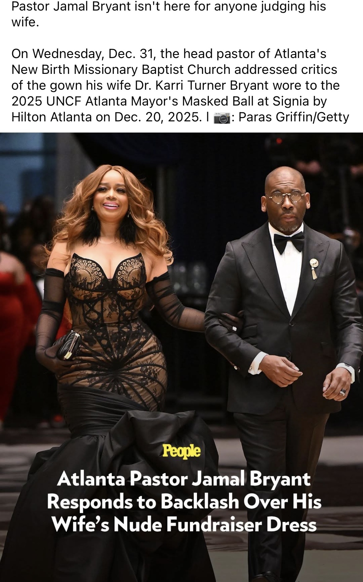 On Wednesday, Dec. 31, the head pastor of Atlanta's New Birth Missionary Baptist Church addressed critics of the gown his wife Dr. Karri Turner Bryant wore to the