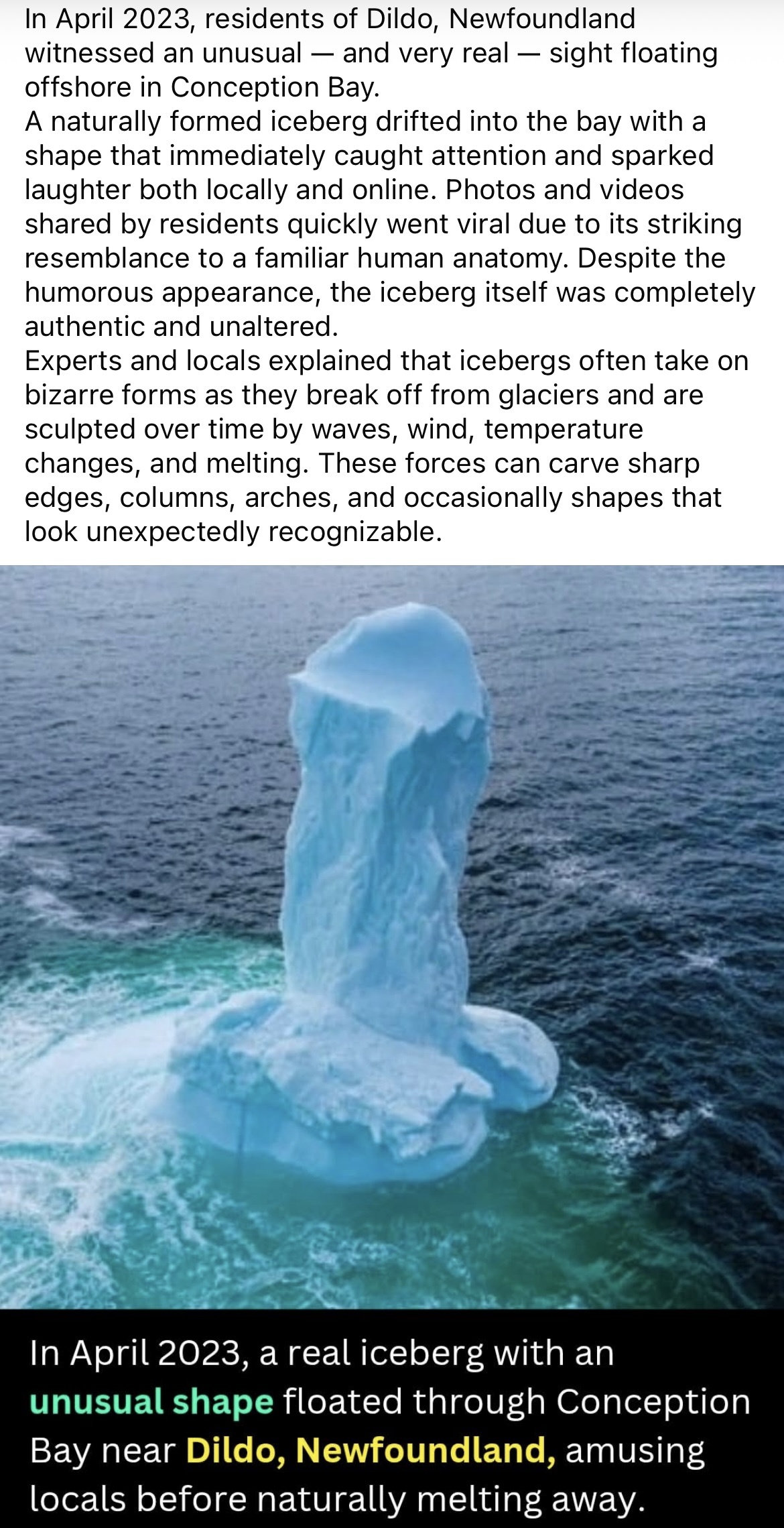 In April 2023, a real iceberg with an unusual shape floated through Conception Bay near Dildo, Newfoundland, amusing locals before naturally melting away.