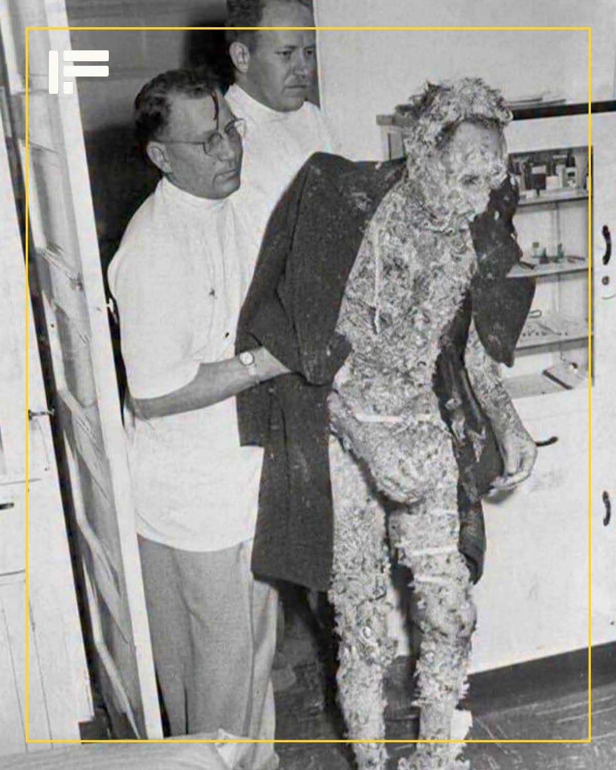 The photograph shows a young man named Grady Johnson, standing upright after being pulled from the La Brea Tar Pits. His entire body is coated in a thick, dark shell of asphalt — rigid, cracked, almost prehistoric in appearance.