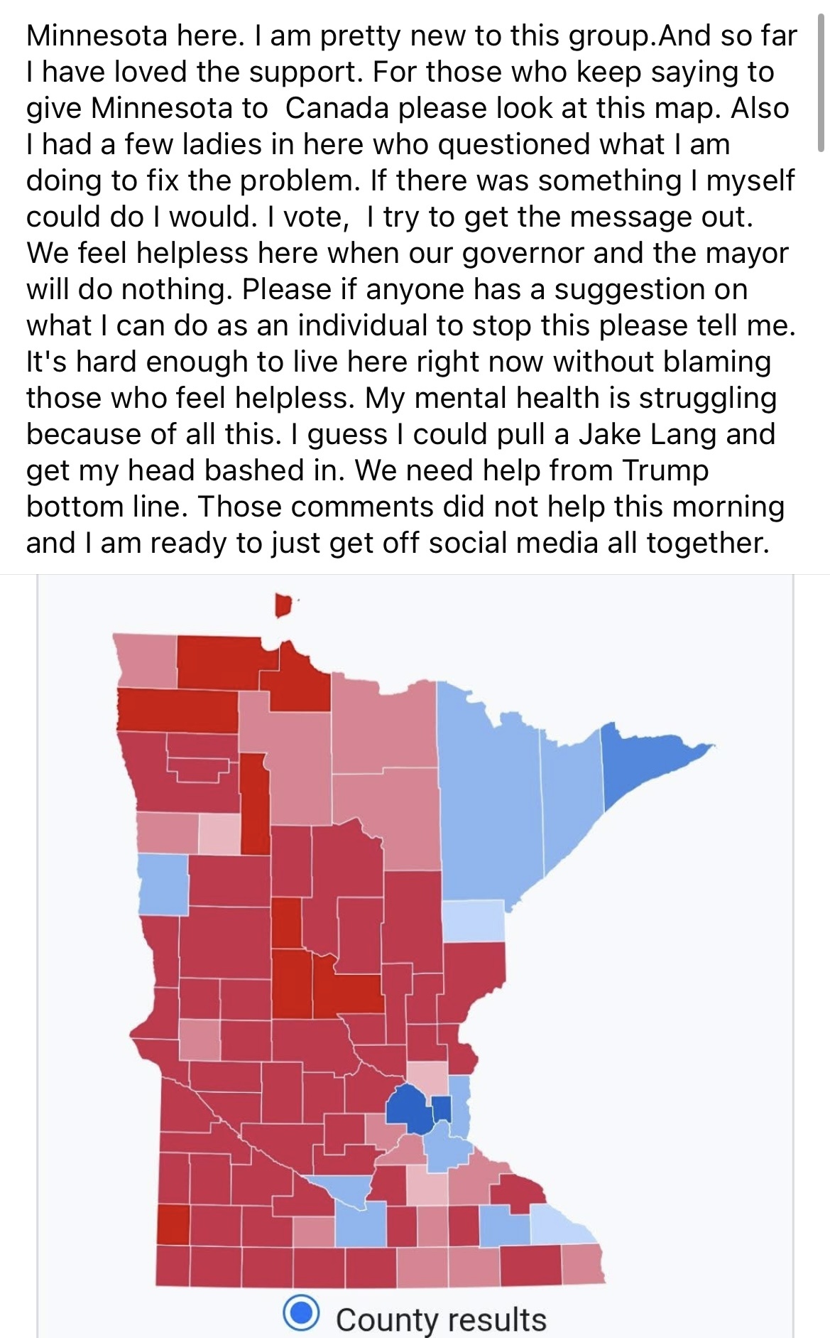 It's hard enough to live here right now without blaming those who feel helpless. My mental health is struggling because of all this. I guess I could pull a Jake Lang and get my head bashed in. We need help from Trump bottom line. Those comments did not help this morning and I am ready to just get off social media all together.