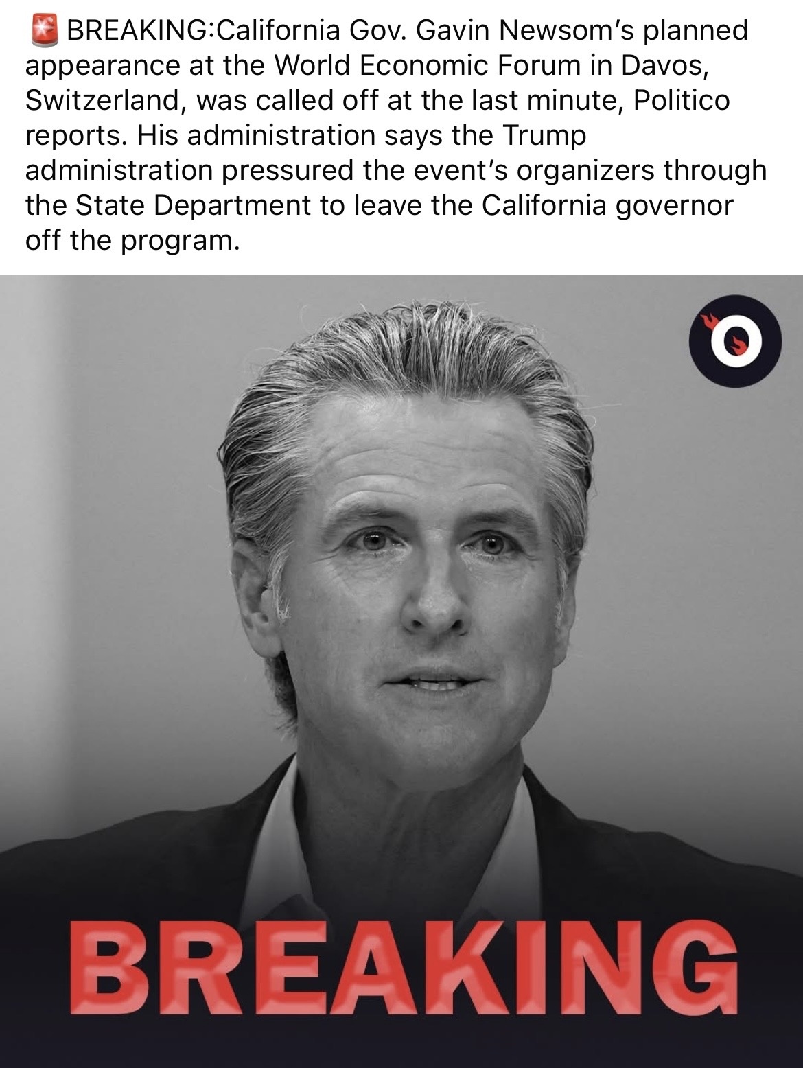 The cancellation occurred shortly after Treasury Secretary Scott Bessent spoke at the same venue, where he reportedly called Newsom “economically illiterate.” Newsom had planned to use his address as a rebuttal to President Trump’s earlier speech, specifically criticizing the administration’s focus on Greenland and urging European leaders to stop being “complicit.”