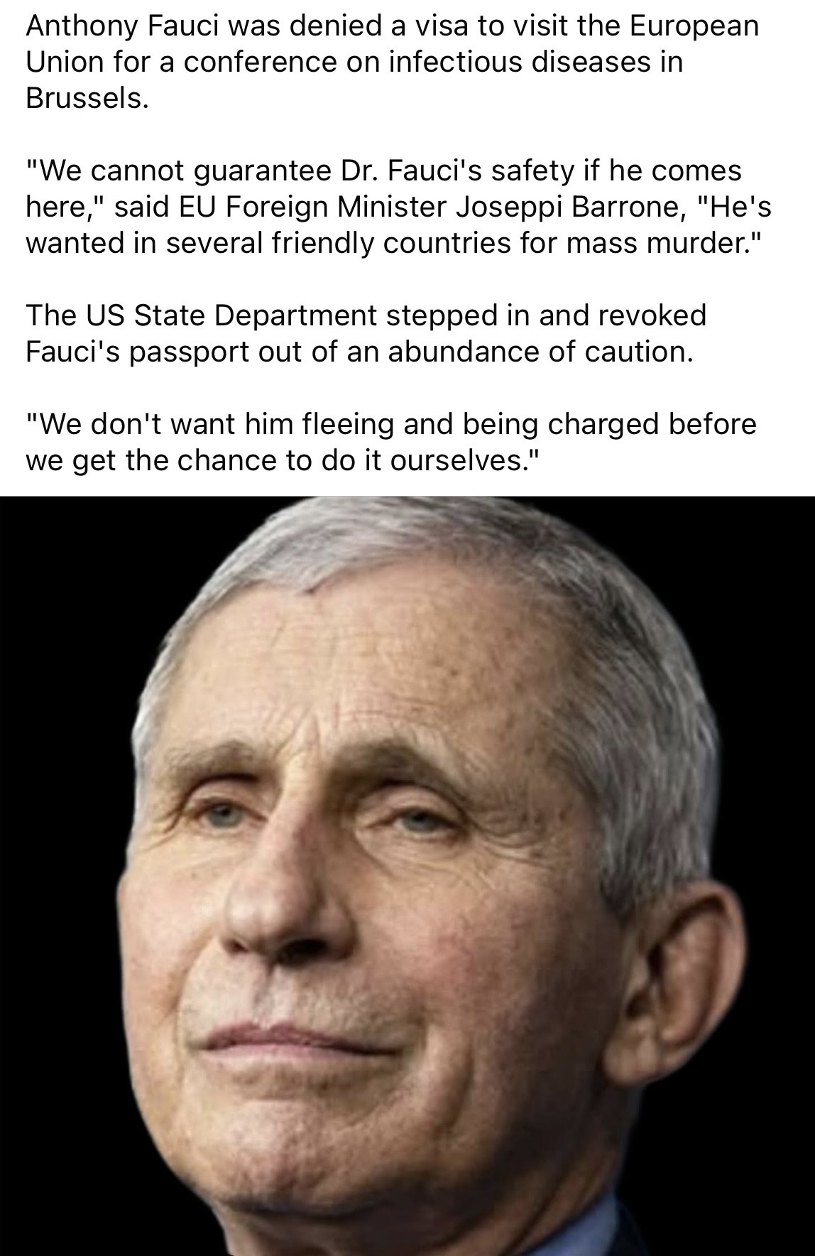"We cannot guarantee Dr. Fauci's safety if he comes here," said EU Foreign Minister Joseppi Barrone, "He's wanted in several friendly countries for mass murder."