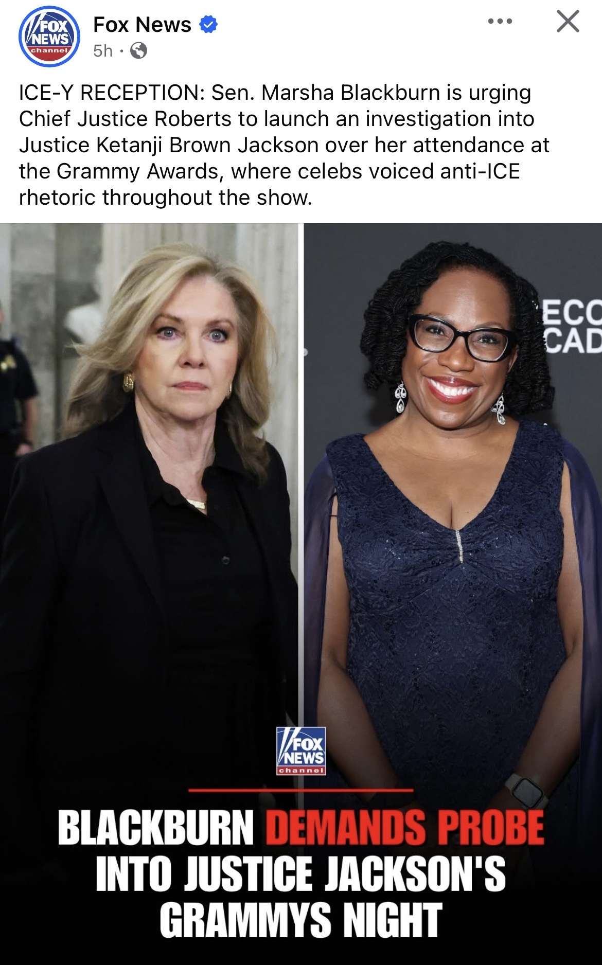 ICE-Y RECEPTION: Sen. Marsha Blackburn is urging Chief Justice Roberts to launch an investigation into Justice Ketanji Brown Jackson over her attendance at the Grammy Awards, where celebs voiced anti-ICE rhetoric throughout the show.