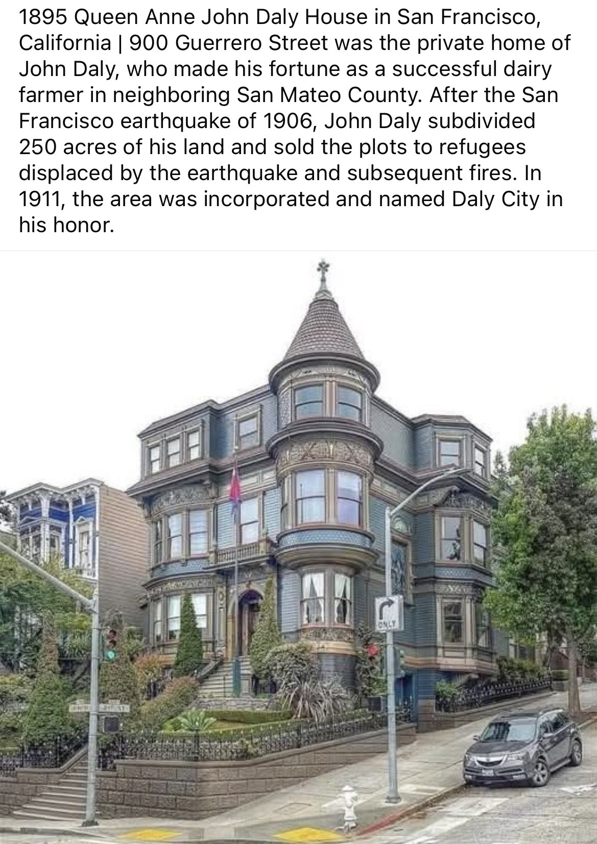 1895 Queen Anne John Daly House in San Francisco, California | 900 Guerrero Street was the private home of John Daly, who made his fortune as a successful dairy farmer in neighboring San Mateo County. After the San Francisco earthquake of 1906, John Daly subdivided 250 acres of his land and sold the plots to refugees displaced by the earthquake and subsequent fires. In 1911, the area was incorporated and named Daly City in his honor.