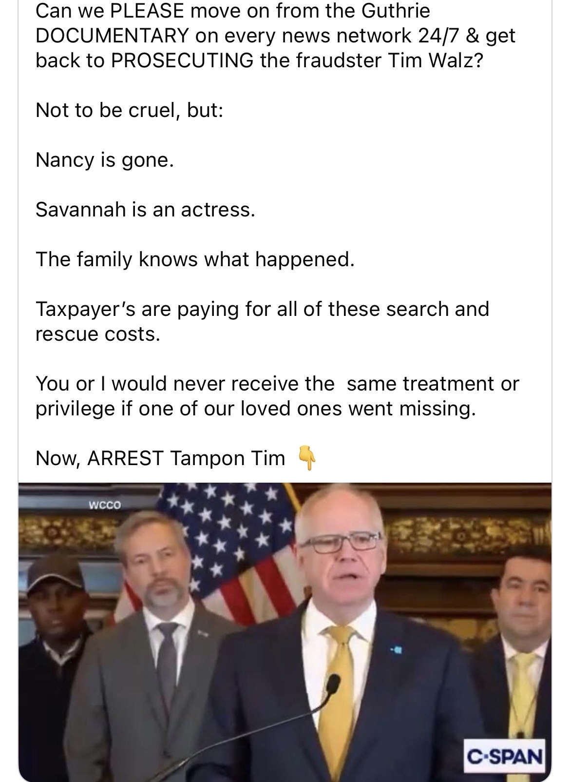 DOCUMENTARY on every news network 24/7 & get back to PROSECUTING the fraudster Tim Walz?