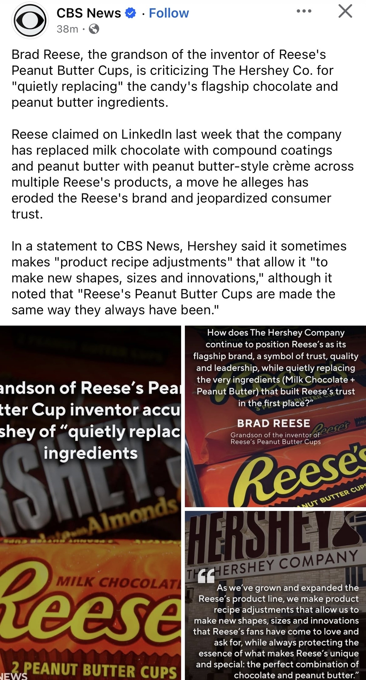 Reese claimed on Linkedin last week that the company has replaced milk chocolate with compound coatings and peanut butter with peanut butter-style crème across multiple Reese's products, a move he alleges has eroded the Reese's brand and jeopardized consumer trust.