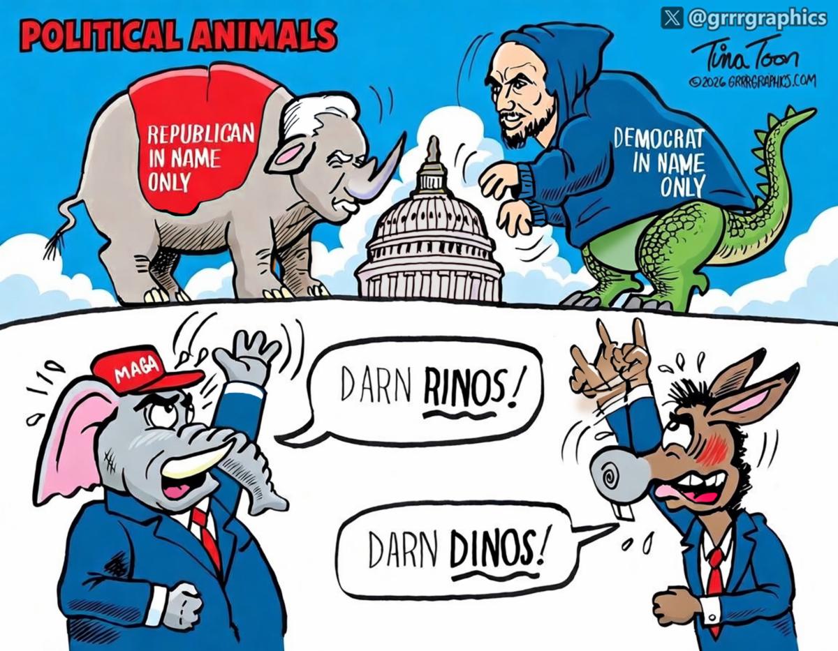 The RINOs (Republicans In Name Only) and DINOs (Democrats In Name Only) are circling the Capitol dome like it’s feeding time at the world’s most expensive zoo. In front of the cameras, the big beasts growl and posture. But on main street, the frustrated voters are losing it:“DARN RINOs!” “DARN DINOs!”