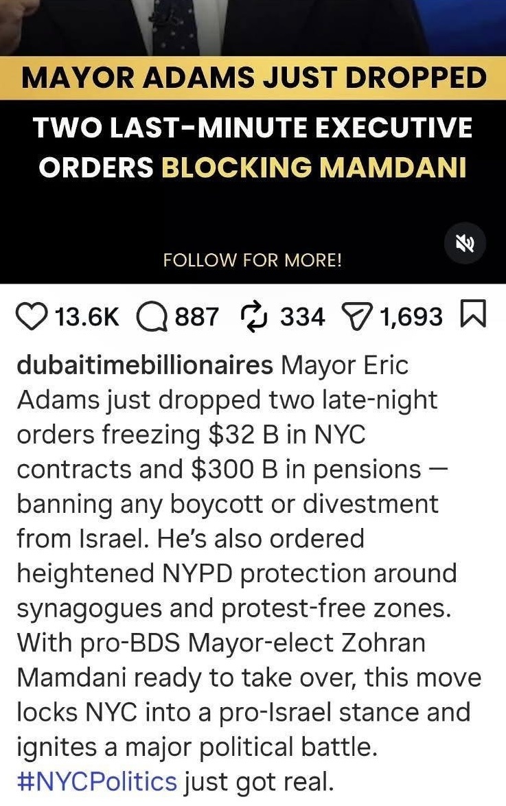 Mayor Eric Adams just dropped two late-night orders freezing $32 B in NYC contracts and $300 B in pensions - banning any boycott or divestment from Israel. He's also ordered heightened NYPD protection around synagogues and protest-free zones.